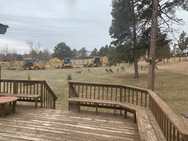 I sent my family a picture taken of our back yard yesterday, challenging them to count the number of deer in our yard. It was a bit of a family joke. You can see for yourself. I count 9 deer and 2 Deere. Our father, among other ventures of his life, was a John Deere dealer for 25 years. Our shop had franchises for agricultural, industrial and lawn equipment. The franchise and the shop were sold nearly 40 years ago, so backhoes were a bit smaller in those days, but the equipment parked in my back yard was a fun reminder of our family business. For those of you who think I can’t count, the middle machine is a Komatsu, not a Deere.
